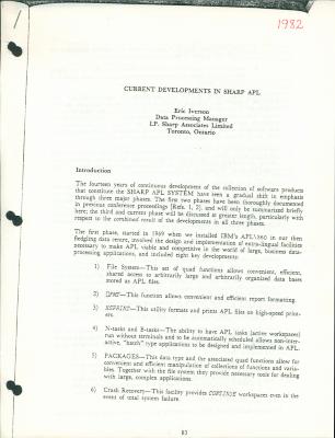 A photocopied report summarizing the current developments in SHARP APL at the time, with an emphasis on interfaces.