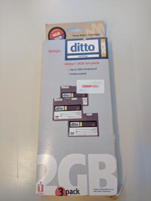 A pack of three Iomega Ditto 2GB tape cartridges. These came out in 1996 for the Ditto 2GB drive, a tape storage system primarily for computer backups.
